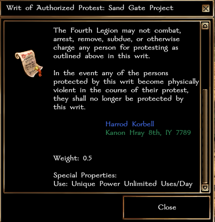 Sergeant Hanson has made clear that he intends to try and prevent this protest with violence if necessary unless we have Writ to authorise this protest. For him to attack our College unduly would violate the Springtime Promise and to shut down a protest would violate the freedoms of Ephian's everywhere.