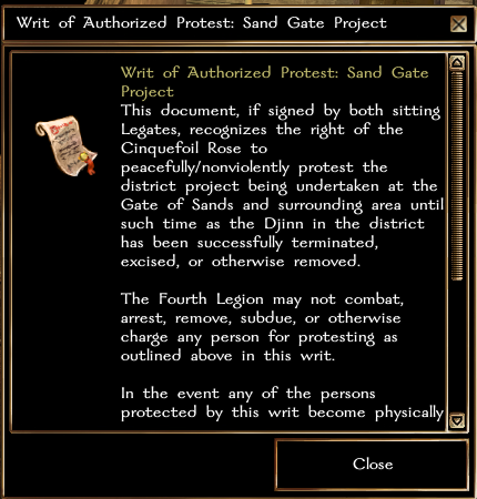 Tomorrow my Student Arthur intends to protest outside the Sand Gate to petition to Gohari Heavy Industries to allow us to adequately resolve the Djinn taint that yet lingers there afore they endanger the lives of their workers and the future prosperity and safety of the Refugees of Ephia's Well.
